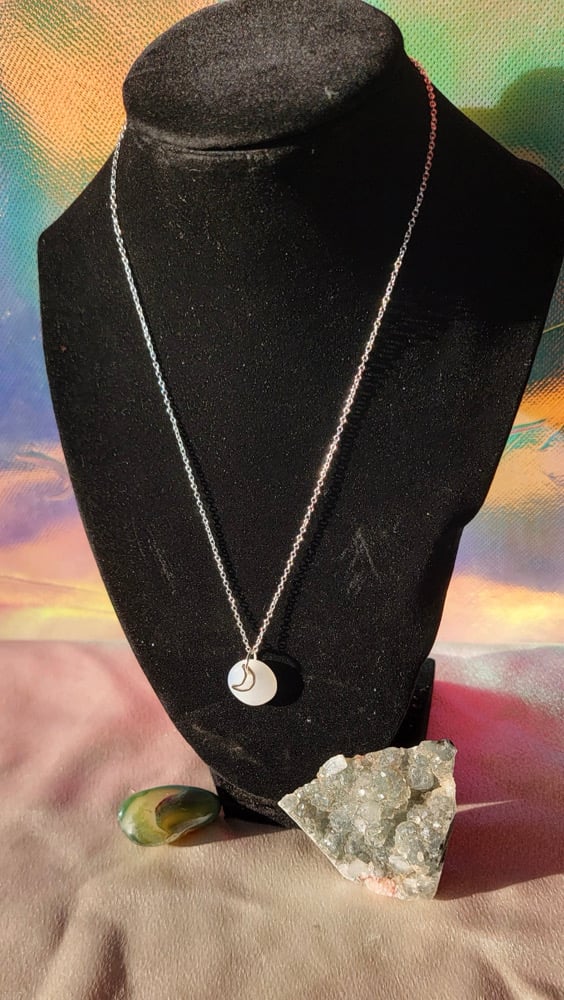 Handmade Glass circle pendant with a silver plated crescent moon with a 18’ silver plated chain