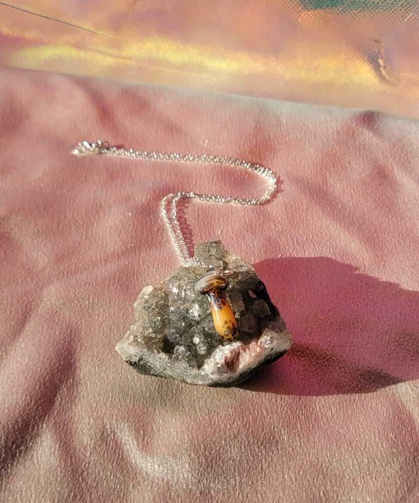 Handmade and sculpted glass Mushroom with a 18’ silver plated chain
